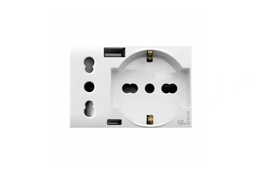 Prise multifonction incluant une prise 2P+T Schuko, une prise 2P 16A et un chargeur USB Type A&C pour répondre à tous vos besoins électriques et de recharge. Conçue pour la gamme Domus 44, elle offre une installation facile, un usage sûr et durable, avec un design moderne et élégant.